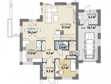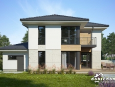 Piękny, reprezentacyjny dom w nowoczesnym stylu. Szczególnym atutem są pełnowymiarowe pomieszczenia na piętrze. Ciekawa bryła podkreślona została grafitową stolarką i drewnianymi obiciami. Dom ten zaprojektowany został tak, aby każdy z jego mieszkańców miał maksymalny komfort użytkowania. W wiatrołapie i hallu przewidziano miejsca na zabudowane szafy, co pozwoli w łatwy sposób utrzymać porządek. Duża kuchnia otwarta jest na jadalnię. Można jednak w prosty sposób zamknąć ją ścianką lub drzwiami przesuwnymi. Pokój dzienny jest jasny i przestronny. Znajdujące się w nim otwarte schody, poprzez nietuzinkową aranżację, mogą stać się bardzo ciekawym elementem wystroju. Całości funkcji parteru dopełniają: dyskretnie schowana w małym korytarzu łazienka, przydatna spiżarnia, gabinet oraz garaż jednostanowiskowy wraz z kotłownią. Piętro to strefa prywatna domowników. Idealnie spełni potrzeby rodziny 2+2. Warto zauważyć apartament przewidziany dla Gospodarzy: duża sypialnia w wyjściem na balkon, z osobną garderobą i łazienką. Pozostałe dwa pokoje są pięknie doświetlone. Do wspólnej łazienki jest przejście przez garderobę. Projekt dostępny w wersji z garażem dwustanowiskowym – Andrea II.
